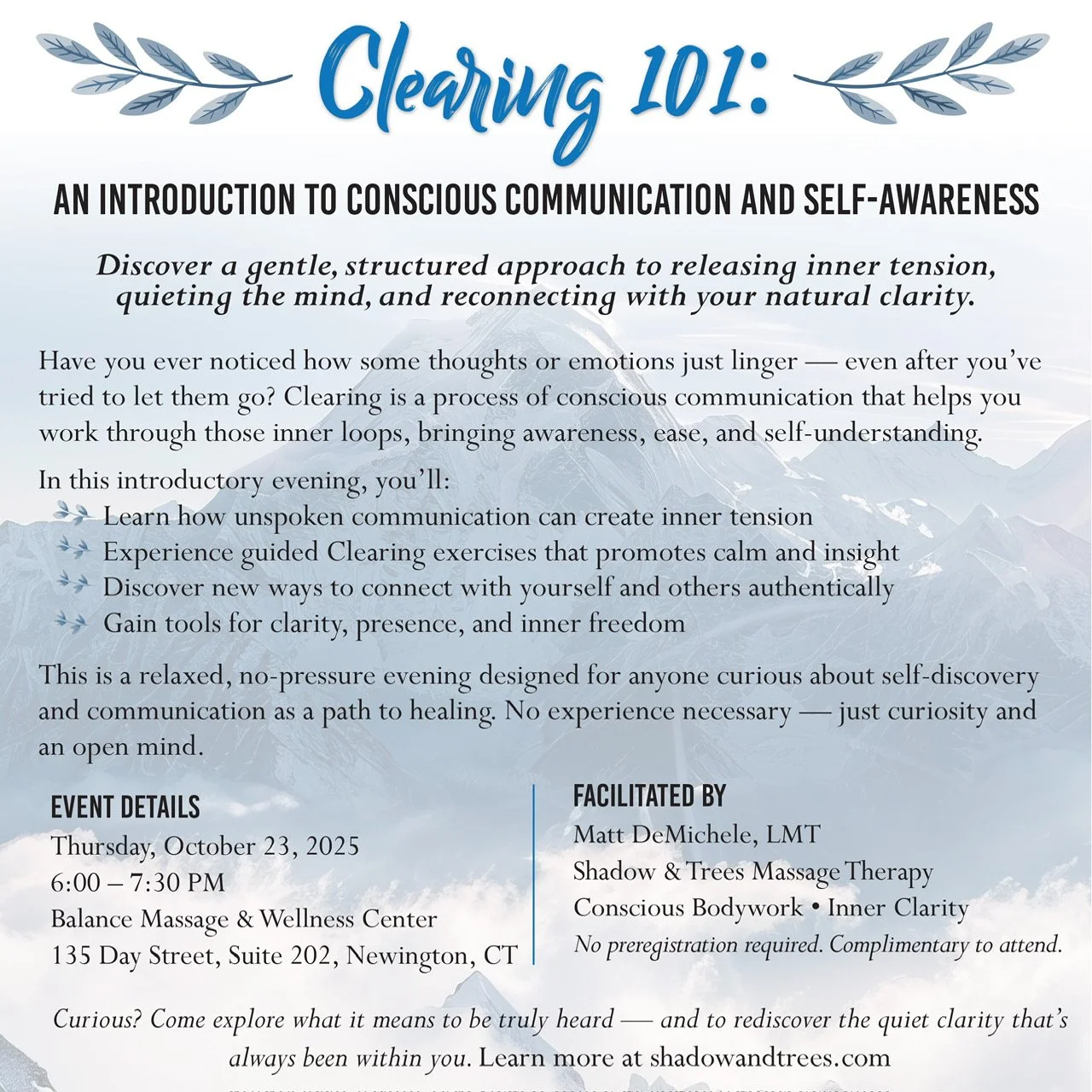 Clearing 101 with Matt DeMichele Thursday, October 23, 2025 6:00 PM 7:30 PM Balance Massage & Wellness Center 135 Day St Newington, CT 06111 United States (map) Google Calendar ICS