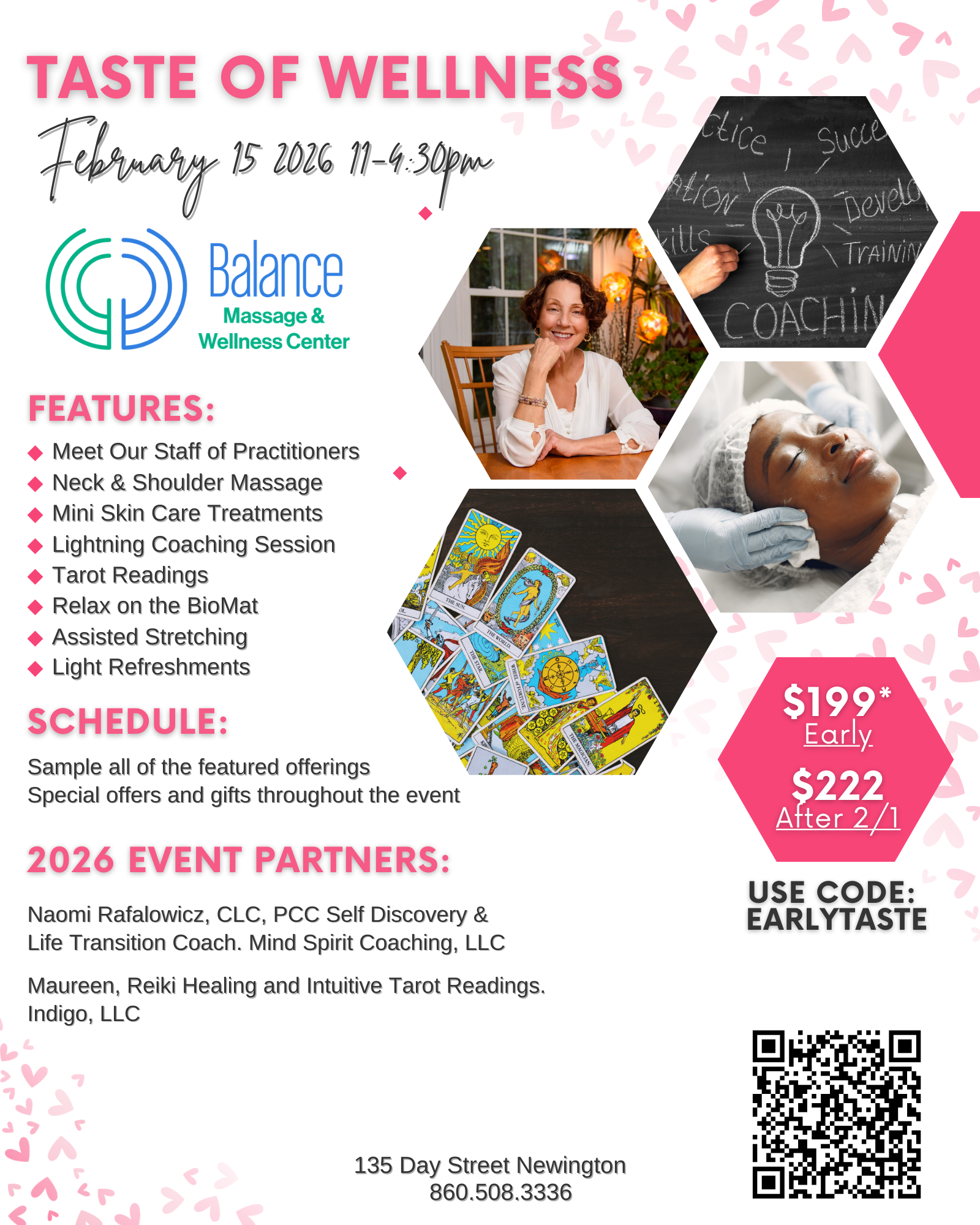 Galentine's Day: Taste of Wellness Sunday, February 15, 2026 11:00 AM 4:30 PM Balance Massage & Wellness Center 135 Day St Newington, CT 06111 United States (map) Google Calendar ICS REGISTER